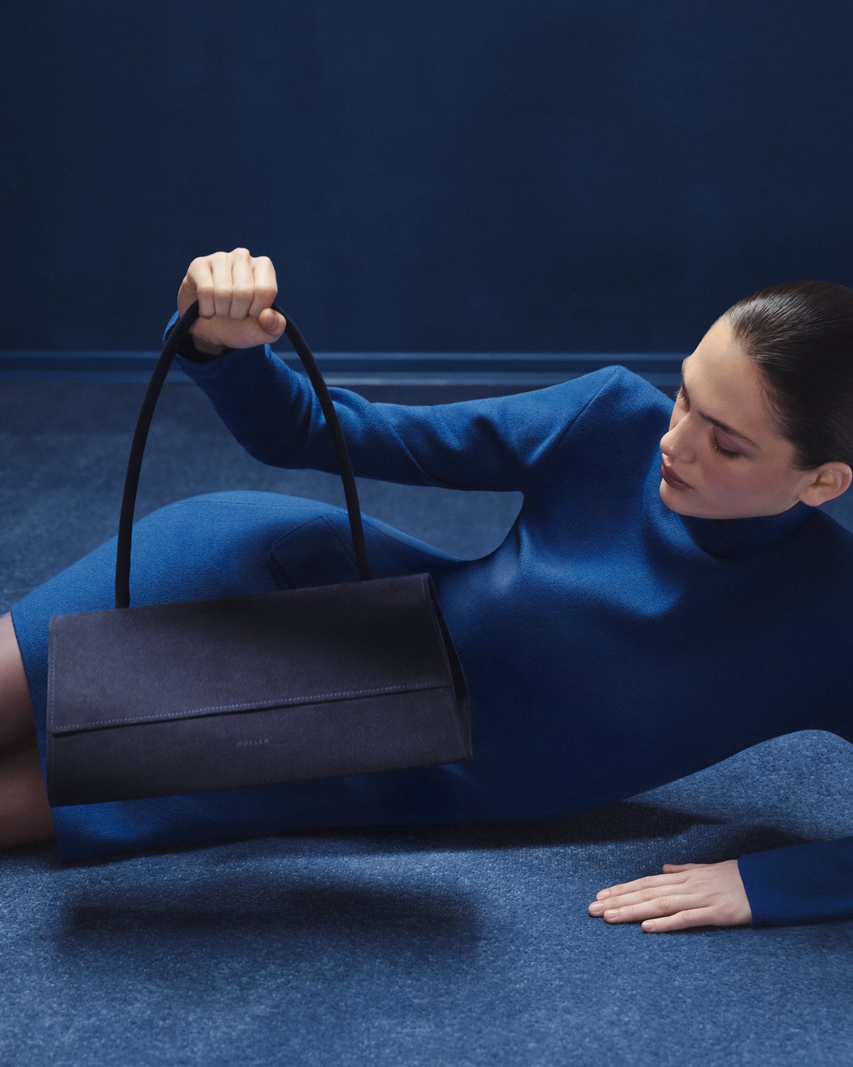 A mystical deep blue hue becomes the leading motif. Iconic POELLE pieces — the Carolyn and Object №03 shoppers, the Elza clutch, and the Bell bag — appear in soft suede shades of blue.