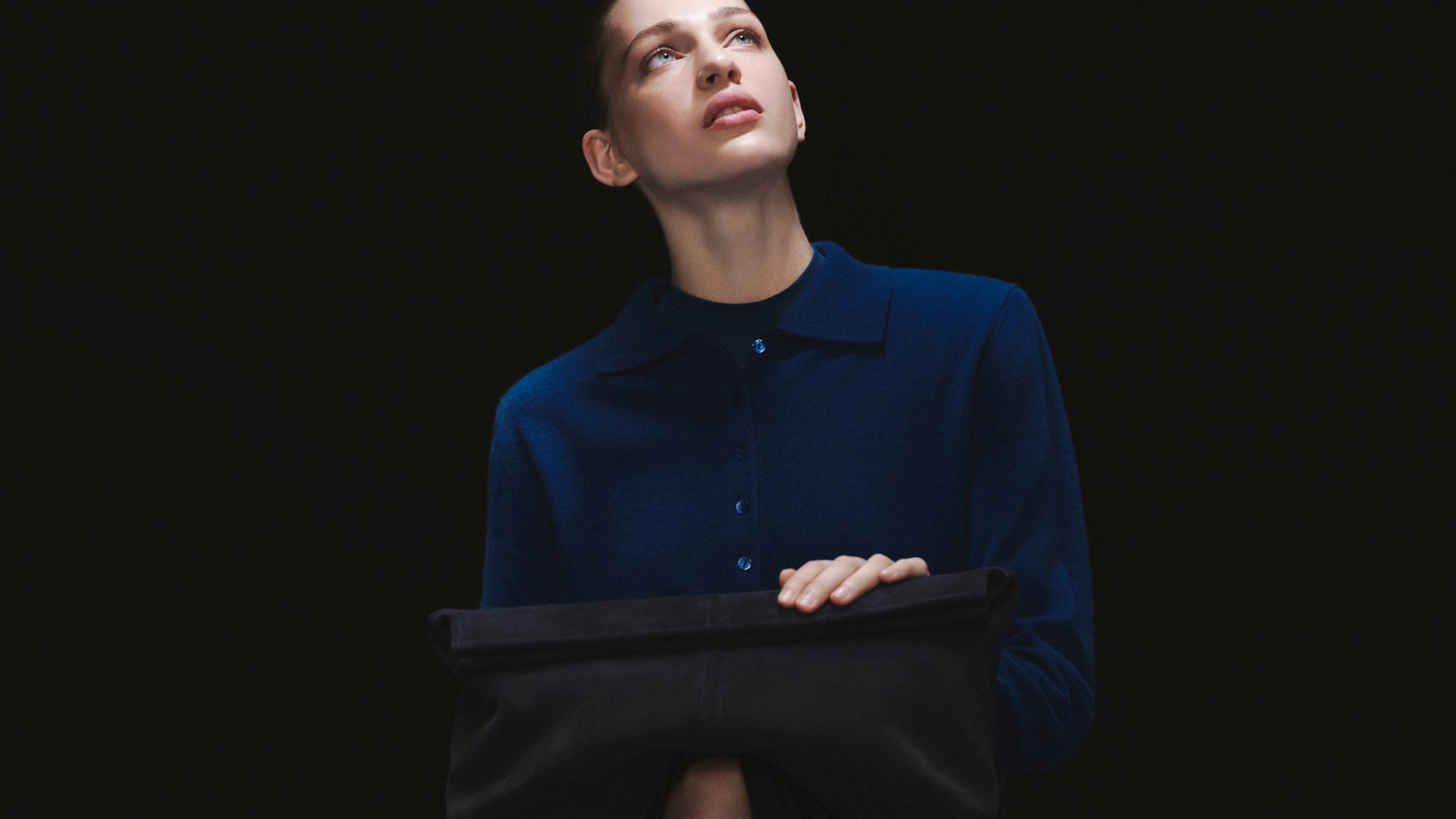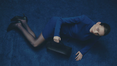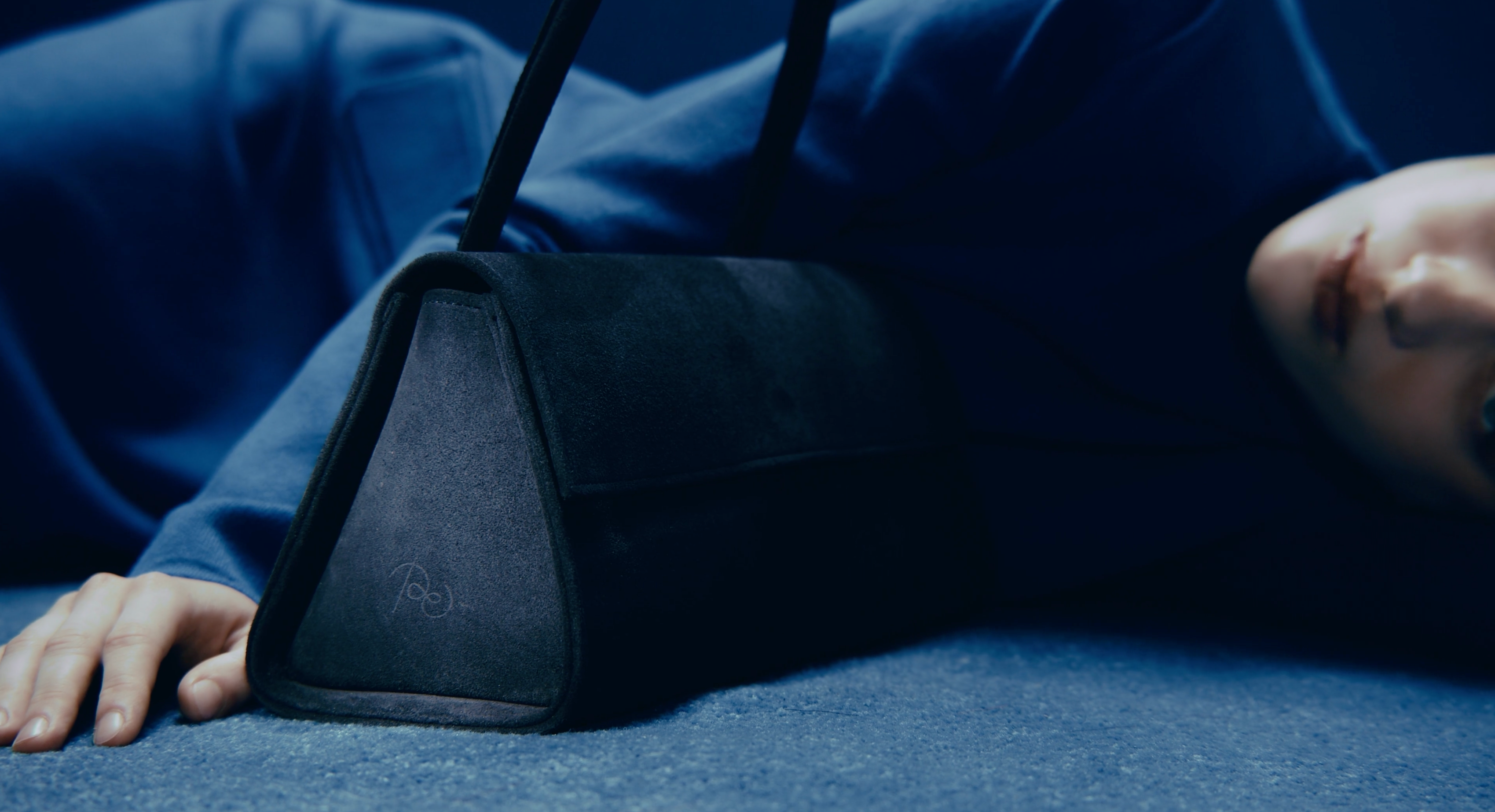 A mystical deep blue hue becomes the leading motif. Iconic POELLE pieces — the Carolyn and Object №03 shoppers, the Elza clutch, and the Bell bag — appear in soft suede shades of blue.